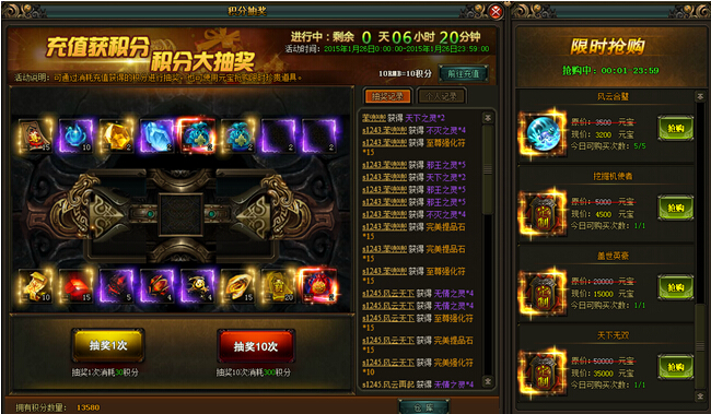 《风云无双》8月12日 积分抽奖(具体奖励内容以游戏中为准)玩家每进行充值10RMB就会获得10积分,积分可在积分抽奖中抽取相应物品,会上架一些超值的道具供玩家限时元宝兑换【活动时间】: 8月12日-8月14日【活动范 ...