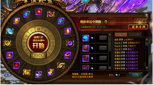 幸运轮盘(具体奖励内容以游戏中为准)【活动时间】8月15日-8月18日【活动范围】未在开服活动中的区服【活动内容】活动期间,凡充值即可领取幸运令牌以及积分,幸运令牌可进行抽奖,积分可用来兑换奖励,积分兑换道 ...