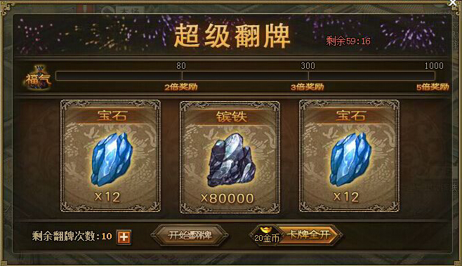 活动一超级翻牌,好礼最高5倍送!粮食、镔铁、宝石、经验、免费借兵等多种翻牌奖励,轻松获得,极致满足。鸿运当头,不断翻到“福气牌”,不停累积“福气值”,更能豪享最高5倍奖励! 只有1天,机不可失!活动范围: ...