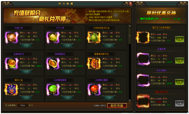 【风云无双】积分商城(具体奖励内容以游戏中为准)玩家每进行充值10RMB就会获得10积分,积分可在积分商城处兑换道具,更有限时优惠兑换,会上架一些超值的道具供玩家限时兑换【活动时间】:8月29日-9月1日【活动范 ...