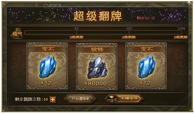 活动一超级翻牌,好礼最高5倍送! 粮食、镔铁、宝石、经验、免费借兵等多种翻牌奖励,轻松获得,极致满足。鸿运当头,不断翻到“福气牌”,不停累积“福气值”,更能豪享最高5倍奖励! 只 ...