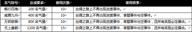 万邦来朝、宝石矿脉 活动一:万邦来朝,丝绸、锦囊等豪礼不停! 中华巍巍河山,万邦携礼来朝!全新“万邦来朝”活动盛世开启,丝绸、西域锦囊、招商令纷送不停!更有令人惊异的“名气称号”(具有作用于丝绸之路的b ...