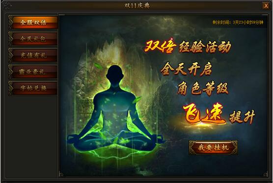 ---------------------------------------------------------双11传奇霸业豪礼来袭,海量奖励拿到手软!活动一:全服双倍活动时间:2015年11月10日00:00-11月13日23:59活动期间,全服双倍经验连开四天,海量经验轻 ...