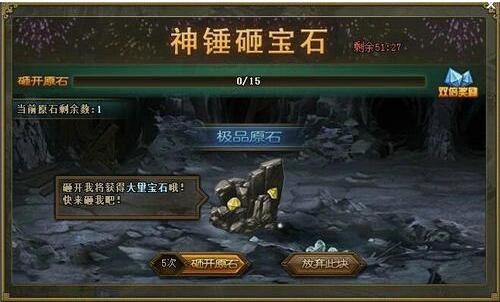 神锤砸宝石、精炼大放送、开采矿山、洗练开光 活动一:新神锤砸宝石,普通原石不计数,免费宝石更多享!活动范围:11月2日(含)之前所有已开在线服活动时间:12月2日0点至24点参与要求:开启宝石功能 活动内容:活 ...