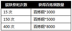 本帖最后由 咸鱼星人 于 2016-1-3 00:28 编辑 镔铁祭祀、犒赏三军、天降神剑 活动一:镔铁祭祀,神兵冲级大送钢! 好消息!福利大升级,已开启“神兵”的玩家,活动将直接升级为钢铁祭祀活动,玩家进行祭祀后, ...