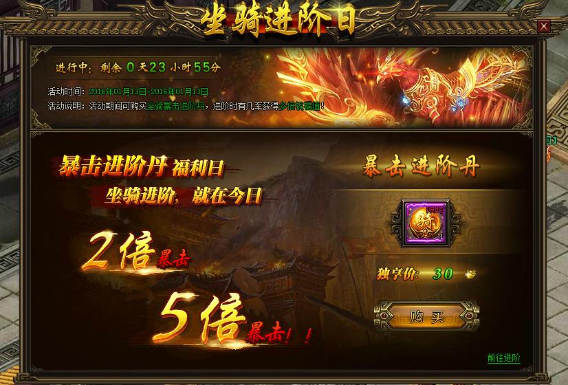 本帖最后由 花开花謝 于 2016-1-9 14:56 编辑 活动时间:开服14天后的每周三00:00到23:59活动说明:进阶日活动有3个,每周三依次循环开启进阶日活动,分别是:坐骑进阶日、神兵进阶日、英魂进阶日,每次开启一个 ...