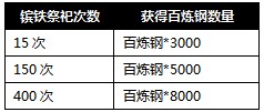 镔铁祭祀、洗练开光、广结名士 活动一:镔铁祭祀,神兵冲级大送钢! 好消息!福利大升级,已开启“神兵”的玩家,活动将直接升级为钢铁祭祀活动,玩家进行祭祀后,将获得百炼钢奖励;加速“神兵”等级的提升,早日 ...