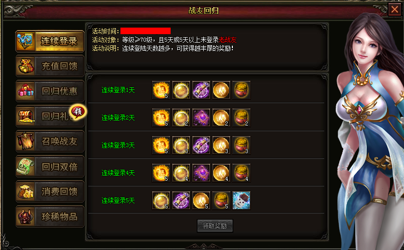 《七杀》战友回归(新) 【活动时间】:2月14日00:00 – 2月20日23:59 连续登陆 【活动对象】:等级≥70级,且5天或5天以上未登陆的老战友 【活动说明】:连续登陆天数越多,可获得越丰厚的奖励 ...