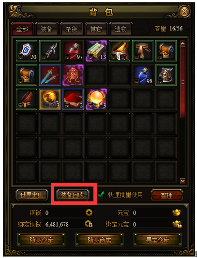 点击背包下方的装备回收,可以打开装备回收界面。 在高等级时,打怪等获取经验的途径效率降低,而装备回收的经验将随着装备等级提高而提高,是后期获取经验的重要途径,平时打BOSS获得的多余装备一定不要扔,在装备 ...