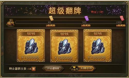 超级翻牌、宝石矿脉、钢铁倾销、天降神剑、洗练开光 活动一:超级翻牌,鸿运当头最高5倍送!粮食、镔铁、宝石、经验、免费借兵等多种翻牌奖励,轻松获得,极致满足。不断翻到“福气牌”,不停累积“福气值”,豪享 ...