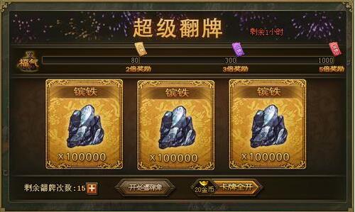 超级翻牌、钢铁倾销、天降神剑、洗练开光 活动一:超级翻牌,鸿运当头最高5倍送!粮食、镔铁、宝石、经验、免费借兵等多种翻牌奖励,轻松获得,极致满足。不断翻到“福气牌”,不停累积“福气值”,豪享最高5倍奖励 ...