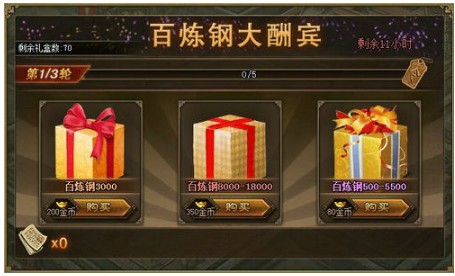 【新】百炼钢大酬宾、超级翻牌、宝石矿脉、精炼大放送、犒赏三军 活动一:【新】百炼钢大酬宾,福利大狂欢! 百炼钢大酬宾,限时1天真情回馈!活动开启后,海量百炼钢大放送,助各位将军一臂之力,快速冲击“神兵” ...