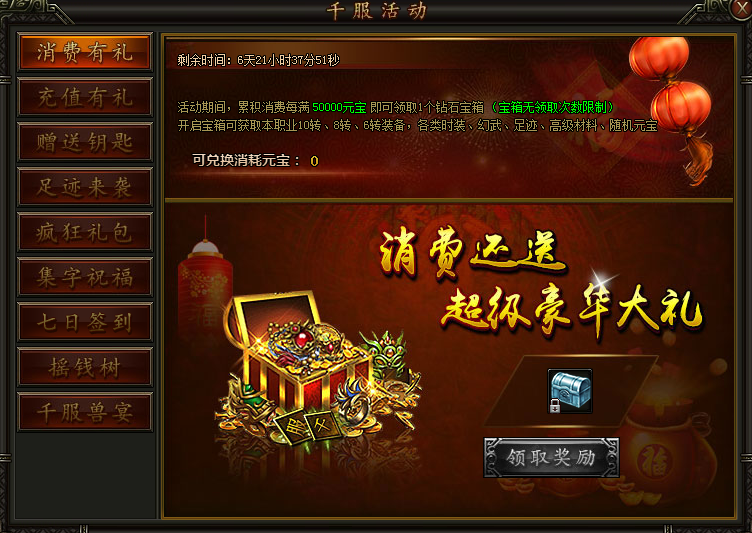 《铁血皇城》千服全民探宝终极首饰尊贵来袭 活动一:消费有礼 活动时间:7月19日-7月25日活动范围:全服活动内容:活动期间,累计消费每满50000元宝即可领取1个钻石宝箱(宝箱无领取次数限制),开启宝箱有机会获得 ...