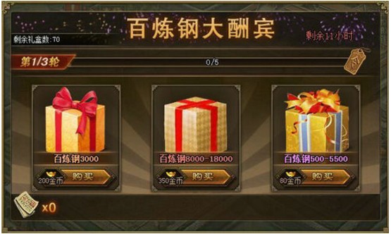 本帖最后由 冥王Fan 于 2016-8-8 22:50 编辑 百炼钢大酬宾、神锤砸宝石、犒赏三军 活动一:百炼钢大酬宾,福利大狂欢! 百炼钢大酬宾,限时1天真情回馈!活动开启后,海量百炼钢大放送,助各位将军一臂之力,快速 ...