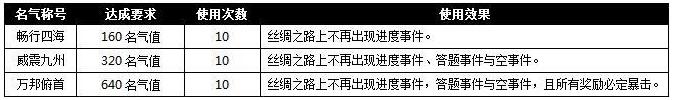 万邦来朝、丝绸大酬宾、神锤砸宝石、古城探宝 活动一:【新】万邦来朝,名气称号奖励升级!活动范围:8月3日(含)之前所有已开在线服活动时间:8月23日0点至24点参与条件:已开启丝绸之路玩家活动内容:活动期间, ...