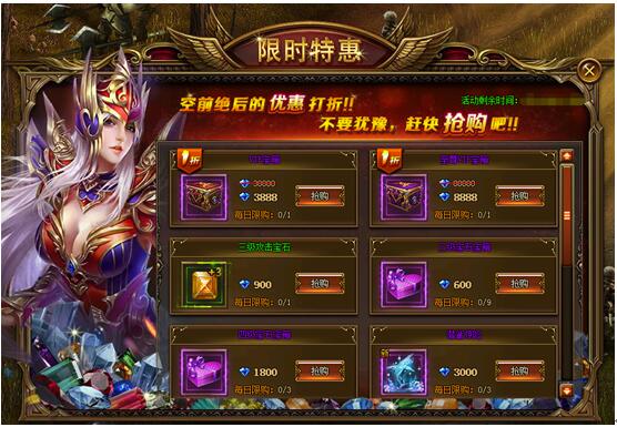 限时特惠 活动时间:2016.09.29 00:00:00~2016.09.30 23:59:59活动内容:活动期间会优惠打折出售部分限量的珍稀道具,还有宝石和打孔石限量出售!千万不要错过了哦! 温馨提示:如上述内容与游戏内有出入,请以游戏 ...