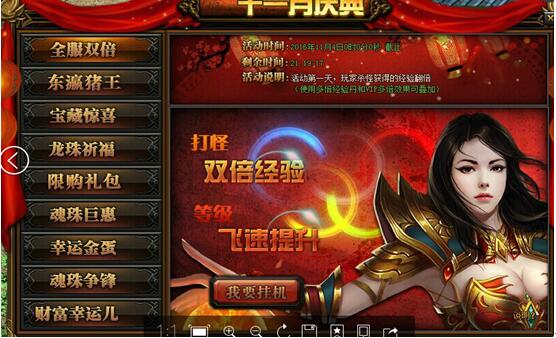 十一月庆典活动时间:11月3日-11月5日活动一:全服双倍活动详情:活动期间玩家打怪挂机可获得双倍经验 ...