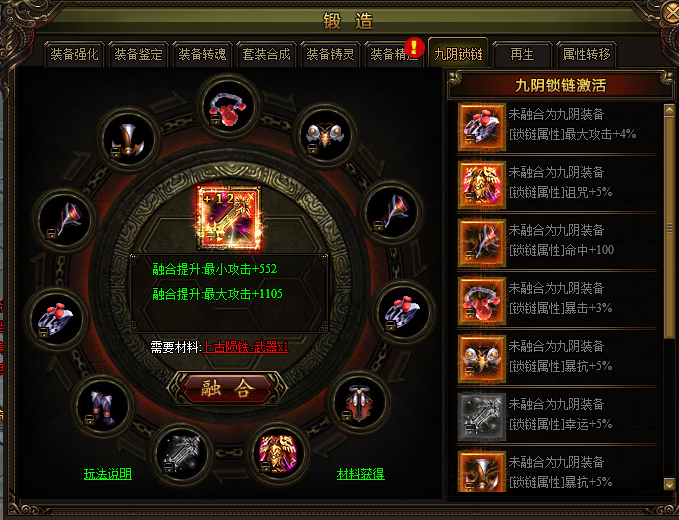 《九阴绝学》锁链系统介绍 一、开启条件 人物达到5转即可开启,平易近人的开启要求,更快拥有九阴锁链专属属性,从此踏上霸主之路! 在再生需要放入两个上古陨铁,花费铜钱,可再生出一个新部位的上古陨铁,再生 ...