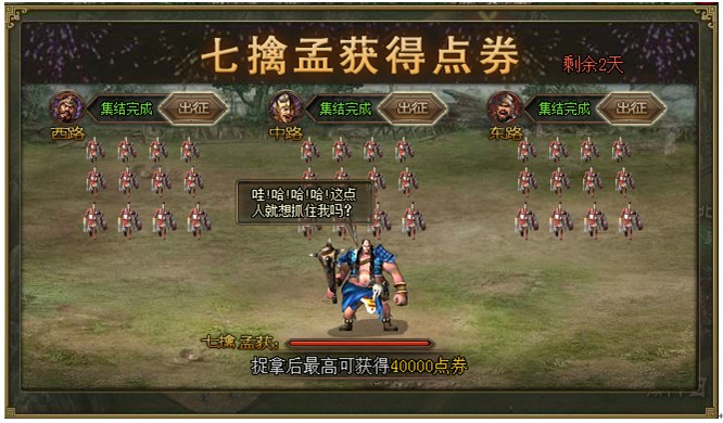三路大军连擒孟获,宝箱连开点券狂送!活动范围:2月21日(含)之前已开所有服 活动时间:3月13日0点至3月14日24点 参与条件:已开启世界地图 活动玩法:活动期间,通过任意战斗中的“借兵”(除单人剧本、世界剧本 ...