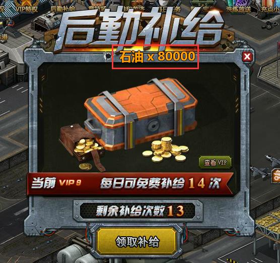 由于每天国战的耗油量巨大,为此我们提供了后勤补给功能,每天可以上线领取石油补给 该功能贯穿游戏整个生命周期,每天都可以进行。所有玩家每天可获得2次领取次数,VIP玩家可根据VIP等级不同,从而获得更多的次数 ...