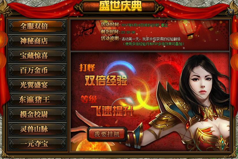 盛世庆典活动时间:7月13日-7月16日活动一:全服双倍活动详情:活动期间玩家打怪挂机可获得双倍经验加 ...
