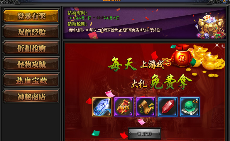 狂欢庆典时间:7月18日——7月20日活动持续三天活动期间,有登陆有奖,双倍经验,折扣抢购,怪物攻城,热血宝藏,神秘商店这些活动 1. 登陆有奖 活动期间,玩家寻宝可获得梁山圣甲/梁山圣衣。玩家穿 ...