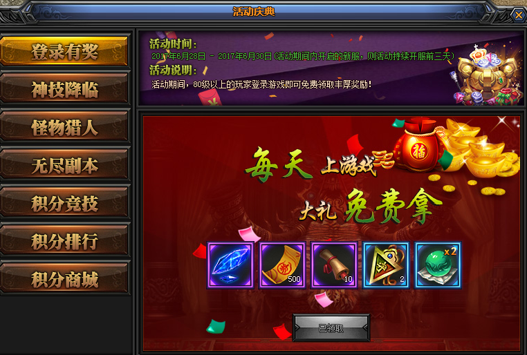 本帖最后由 街角DE幸福 于 2017-7-22 17:55 编辑 狂欢庆典时间:7月27日——7月29日活动持续三天活动期间,有登陆有奖,双倍经验,折扣抢购,怪物攻城,热血宝藏,神秘商店这些活动 登陆有礼 活动期间,玩家 ...