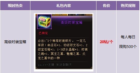 稀有时装宝箱+时装兑换【活动时间】2014年3月18日17:00-3月20日23:59【活动范围】全区【活动内容】活动期间,商城上架高级时装宝箱,各种珍稀道具轻松拥有,本期兑换更是加入了“夜之风”以及“神秘之眼”两件稀有 ...