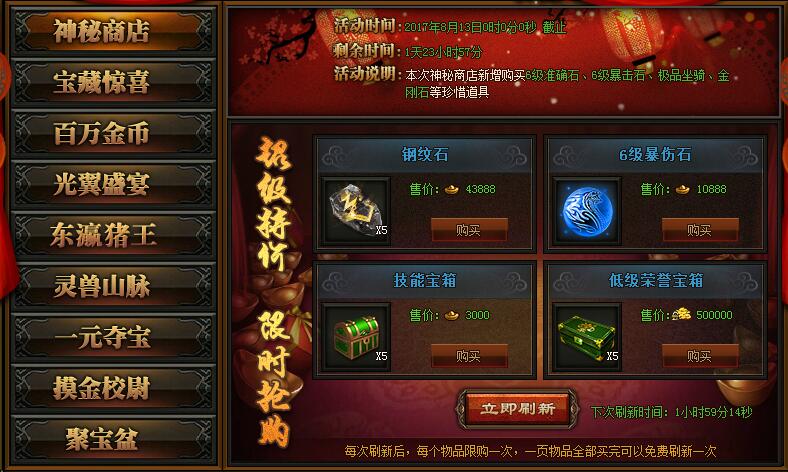 盛世庆典活动时间:8月10日-8月12日活动一:神秘商店活动详情:活动期间神秘商店内会推出极品道具并以 ...