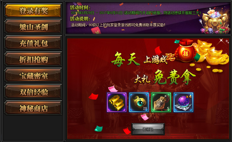 月末庆典 活动时间:8.29-8.31 登陆有奖 活动期间,玩家可以在神秘商店购买超值道具,神秘商店每两小时刷新一次,或者玩家购买完当前展示的道具后自动刷新 ...