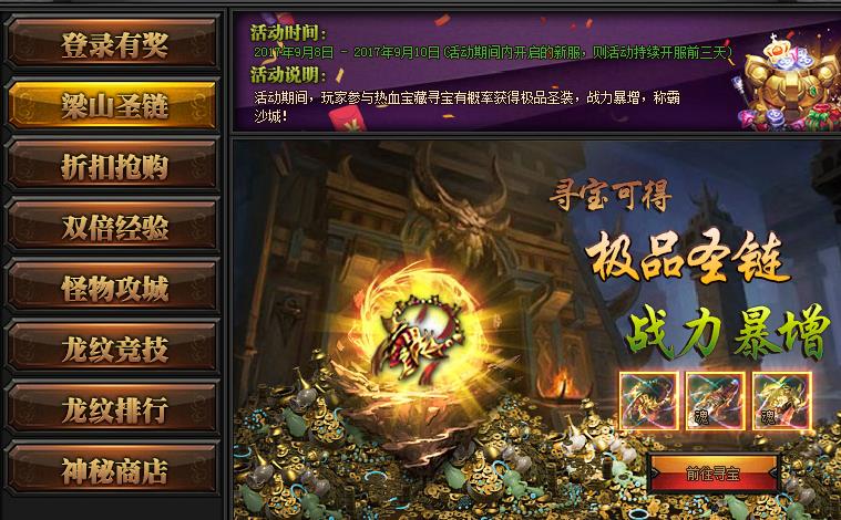 《梁山传奇》9月5日九月庆典(1) 时间:9.5-9.7 活动期间,玩家可以在神秘商店购买超值道具玩家可花费元宝立即刷新道具,也可购买完当前道具后刷新 ...