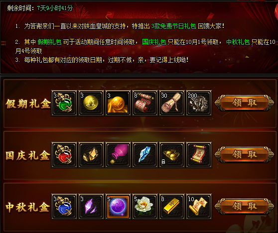 《铁血皇城》中秋国庆活动:盛世狂欢天子守国门,君王死社稷。国难当头,放下的是偏见,留下的是民族。兄弟携手,舍弃的是自私,赢取的是荣耀。举国同庆,为沙城之王的诞生献上礼炮!活动一:国庆礼包活动内容:为答 ...
