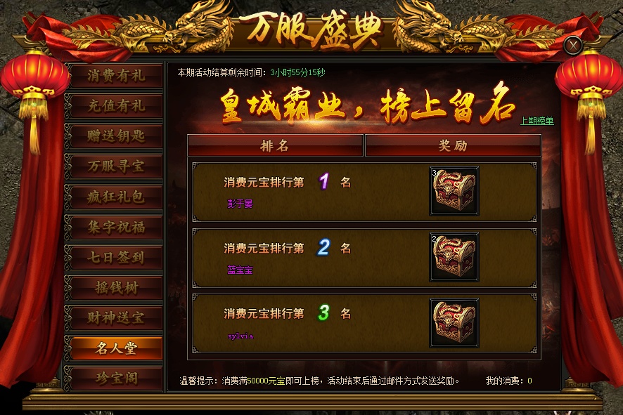 《铁血皇城》10月24日万服盛典特戒专题 神力当道,防御横行 活动一:消费有礼活动时间:10月24日-10月30日活动范围:全服活动内容:活动期间,累计消费每满50000元宝即可领取1个钻石宝箱(宝箱无领取次数限制),开 ...