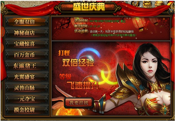 盛世庆典活动时间:11月9日-11月11日活动一:全服双倍活动详情:活动期间玩家打怪挂机可获得双倍经验加成,此效果与VIP加成及经验卷轴不冲突,让您等级飞速提升。 ...