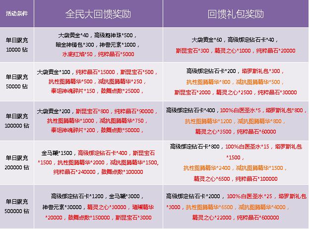 本帖最后由 夏日大猫熊 于 2017-11-17 21:43 编辑 注:两个活动不互斥,都可以参加钻石会员限时超值返利 【活动时间】2017年11月18日00:00~11月22日23:59【活动内容】玩家单日累计充值金额达到1000元,5000元, ...