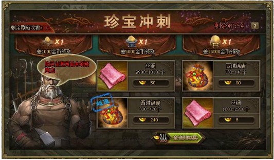 珍宝冲刺、陨铁大放送、精炼大放送、钢铁倾销 活动一:珍宝冲刺,圆你十珍梦! 活动范围:11月4日(含)之前已开所有服 活动时间:11月24日0点至24点 活动内容:活动期间,在活动界面可以购买丝绸、锦囊、珍宝碎片 ...