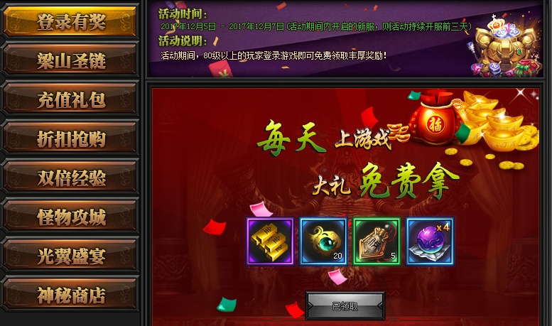 月初庆典时间:12月5日—12月7日1. 登陆有礼 活动期间,玩家每日充值1000元宝即可领取豪华大礼包,礼包每日刷新