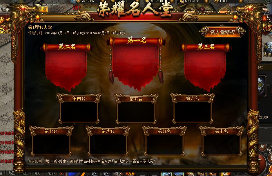 《传奇荣耀》第1届名人堂活动 【活动时间】2017年11月29日-2017年12月5日(7天)【活动范围】全服【活动内容】活动期间,本平台全服范围内战力前十的玩家信息将展示在活动界面中,供全服玩家瞻仰! ...