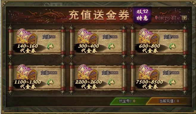 活动二:喜迎双十二,充值送金券!活动范围:11月22日(含)之前已开所有服活动时间:12月12日0点至12月13日24点活动内容:活动期间,满足下列充值额度就能获得代金券奖励。代金券可在其他双十二特别活动中使用。 ※ ...