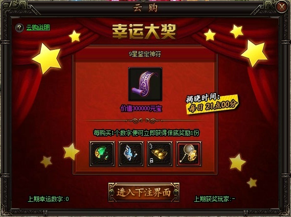 全民云购计划 九星鉴定神符花落谁家 活动时间:12月23日-12月25日云购奖品:九星鉴定神符第一条鉴定属性:HP上限【9星】第二条鉴定属性:攻击上限【9星】(使用神符附加属性时,道士为道攻上限、法师为魔攻上限,战 ...