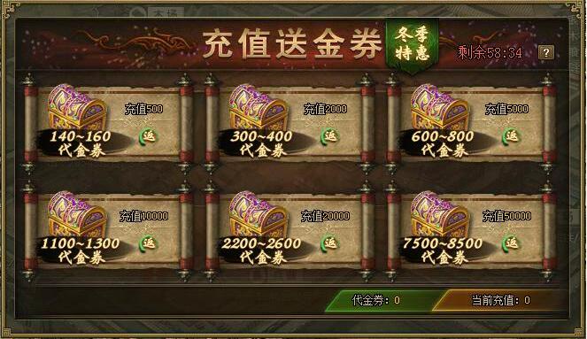 暖冬送金券,献礼冲珍宝 活动一:冬季特惠,充值送金券! 活动范围:12月30日(含)之前已开所有服 活动时间:1月19日0点至1月20日24点 活动内容:活动期间,满足下列充值额度就能获得代金券奖励。代金券可在其他暖 ...