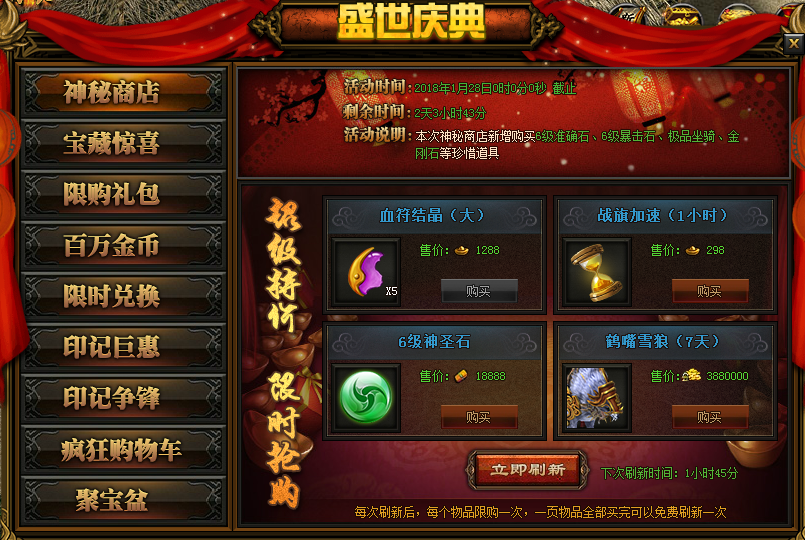 盛世庆典 活动时间:1月25日-1月27日 活动一:神秘商店 活动详情:活动期间神秘商店内会推出极品道具并以超低的价格供玩家购买,本次新增6级准确石、6级暴击石、极品坐骑、金刚石等珍惜道具,玩家可直 ...