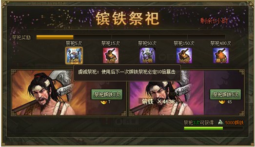【兵器速升】镔铁祭祀,暴击连送! 活动范围:3月17日(含)之前所有已开在线服活动时间:3月24日0点至3月25日24点活动内容:活动期间,达到以下镔铁祭祀要求,即可获赠额外镔铁奖励,并领取相应的暴击Buff!1.  ...