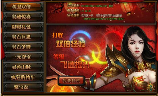 盛世庆典活动时间:4月12日-4月14日活动一:全服双倍活动详情:活动期间玩家打怪挂机可获得双倍经验加 ...