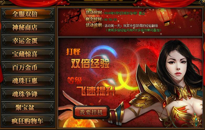 盛世庆典活动时间:5月4日-5月5日活动一:全服双倍活动详情:活动期间玩家打怪挂机可获得双倍经验加成 ...