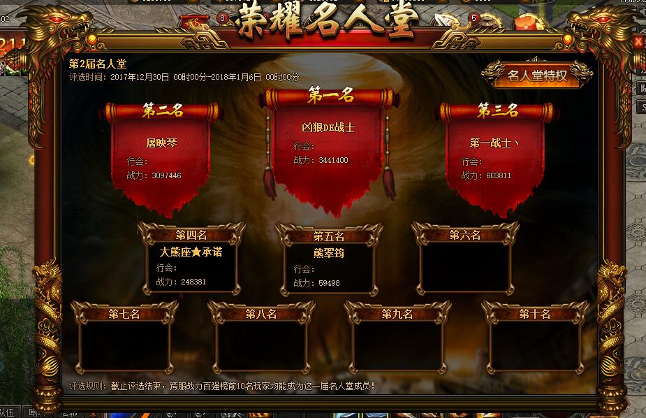 《传奇荣耀》第6届名人堂活动 【活动时间】2018年5月2日-2018年5月8日(7天)【活动范围】全服【活动内容】活动期间,本平台全服范围内战力前十的玩家信息将展示在活动界面中,供全服玩家瞻仰! ...