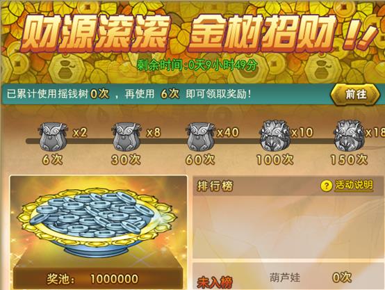 《葫芦娃》5月10日活动公告 活动二金树招财,财源滚滚 活动范围:4月29日(含)之前已开所有服活动时间:5月10日5:00至5月12日5:00活动内容:活动期间,使用摇钱树达到指定次数时,可获得福袋。 ※ 活动玩法1. 使用 ...