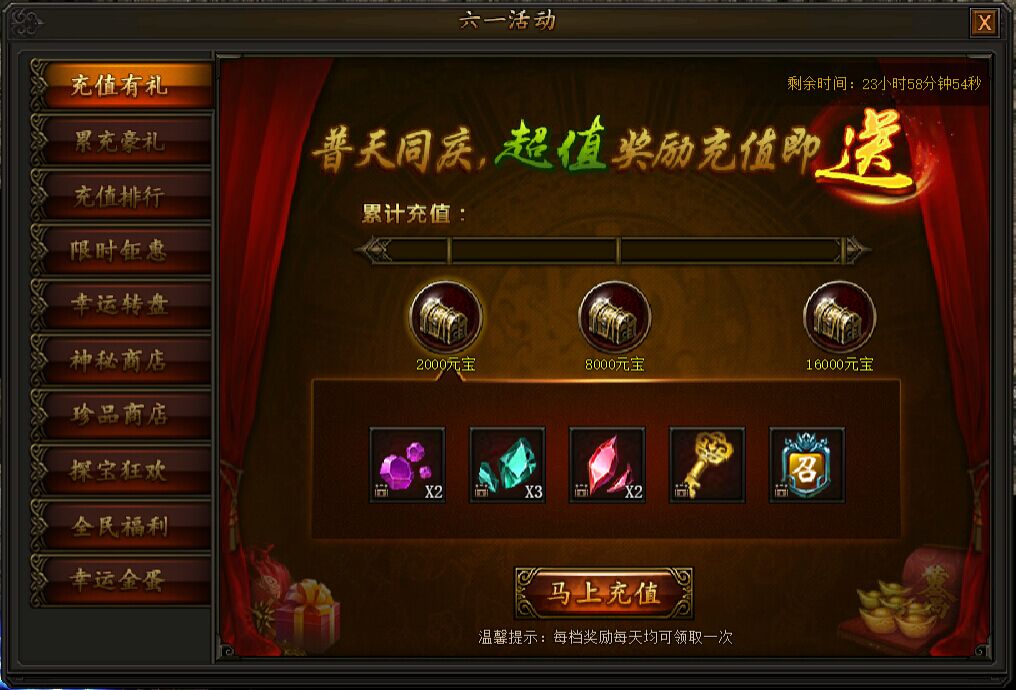 六一活动,豪礼相赠! 1. 充值有礼活动时间:2018年6月1日0点——6月5日23:59活动期间,充值元宝即可领取三档丰厚奖励,每天均可领取一次,不容错过! ...