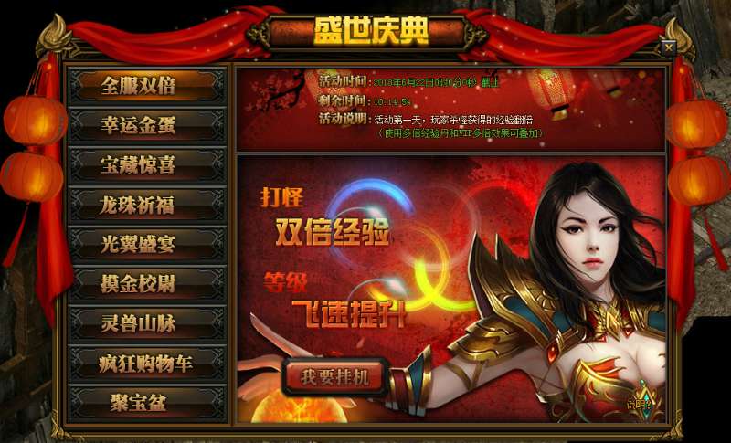 盛世庆典活动时间:6月21日-6月24日活动一:全服双倍活动详情:活动期间玩家打怪挂机可获得双倍经验加成,此效果与VIP加成及经验卷轴不冲突,让您等级飞速提升。 ...