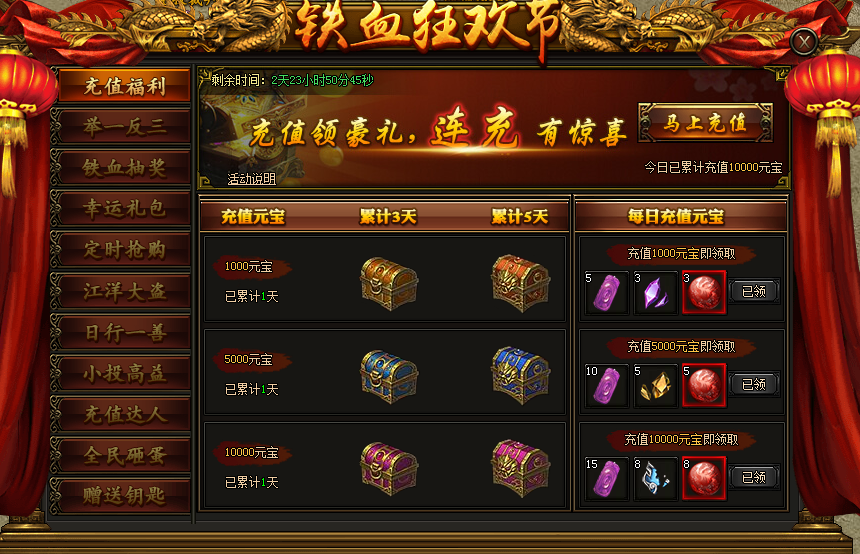 铁血狂欢节活动范围:全服活动时间:7月17日-7月21日1. 充值福利活动期间,充值相应元宝,即可在界面右侧领取对应的每日充值奖励。连冲更有好礼相送。 ...